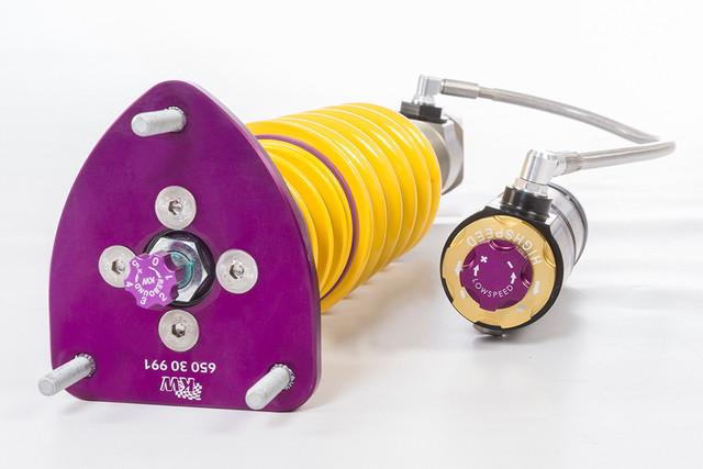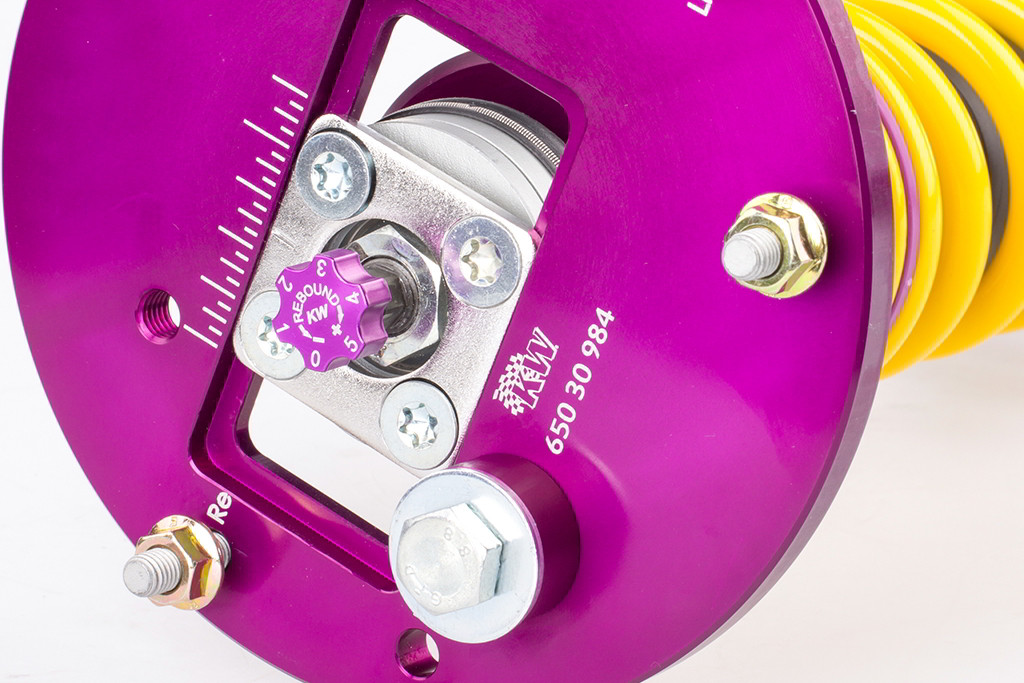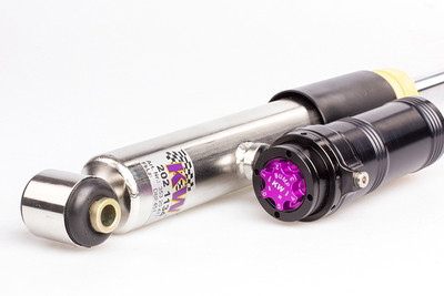 Similar to the KW Racing suspension used in international motorsports, the KW V4 Clubsport coilover kit allows fine tuning of the compression damping separately in the low-speed and high-speed range. The click adjustments of the TVCLH-A valve technology make for easy adjustment directly on the reservoir. You can modify the low-speed compression damping with 6 precise clicks with the purple low speed adjustment dial and directly beneath it the golden adjustment wheel provides an additional 14 precise clicks of high speed compression adjustment. In addition, the TVR-A technology provides 16 clicks to noticeably adjust the rebound damping independently of the compression damping. If you would like to adjust the KW V4 Clubsport coilover kit it can easily be adjusted for more comfort or to an alternative setup for a new race track. The KW V4 Clubsport benefits from the same motorsports technology that has proven its endurance with multiple overall wins at the ADAC Zurich 24h Nürburgring race.