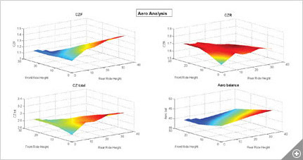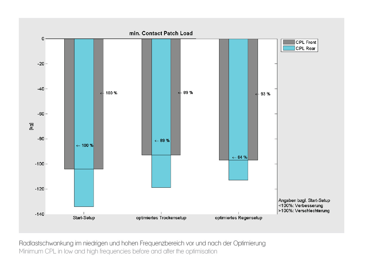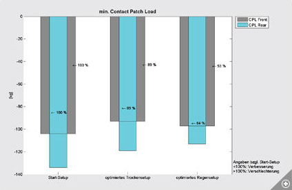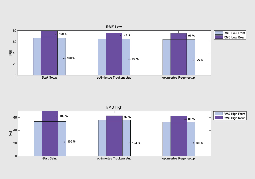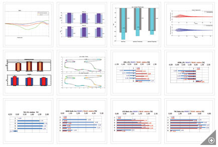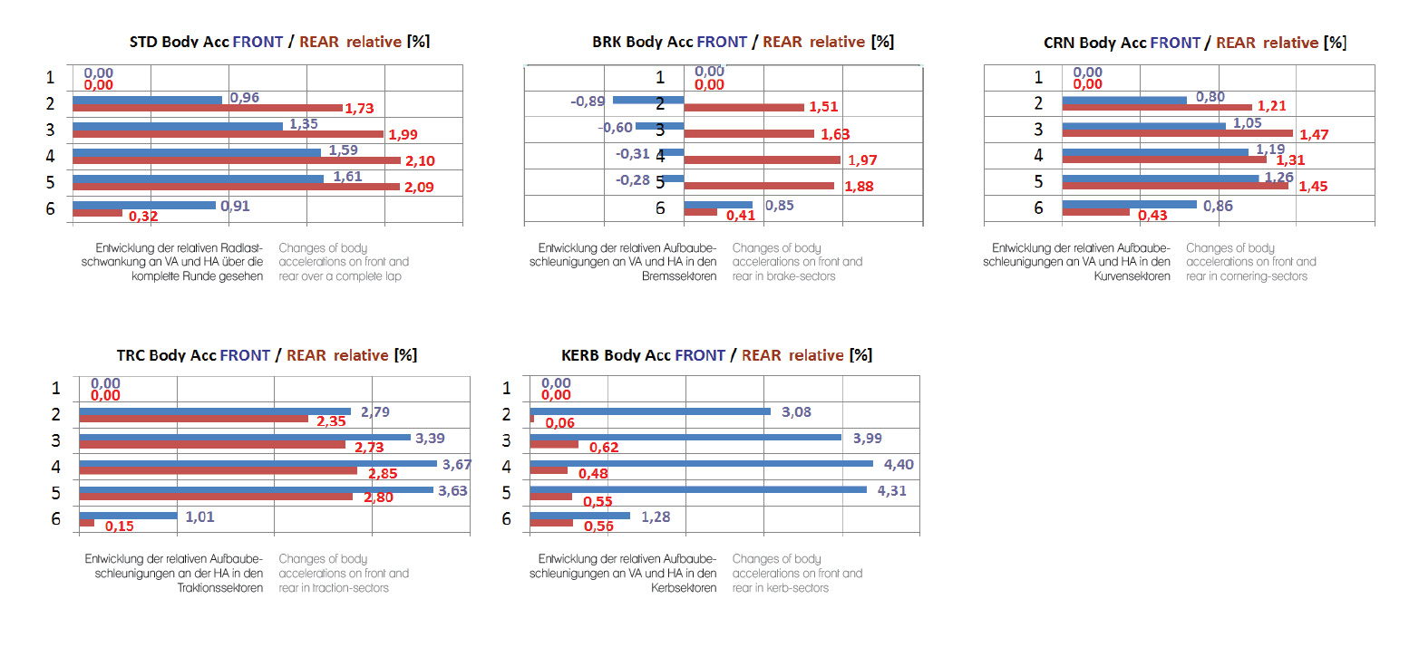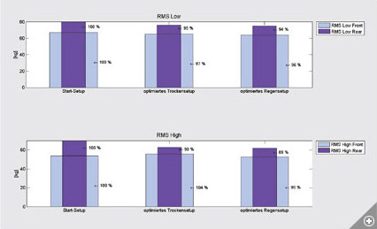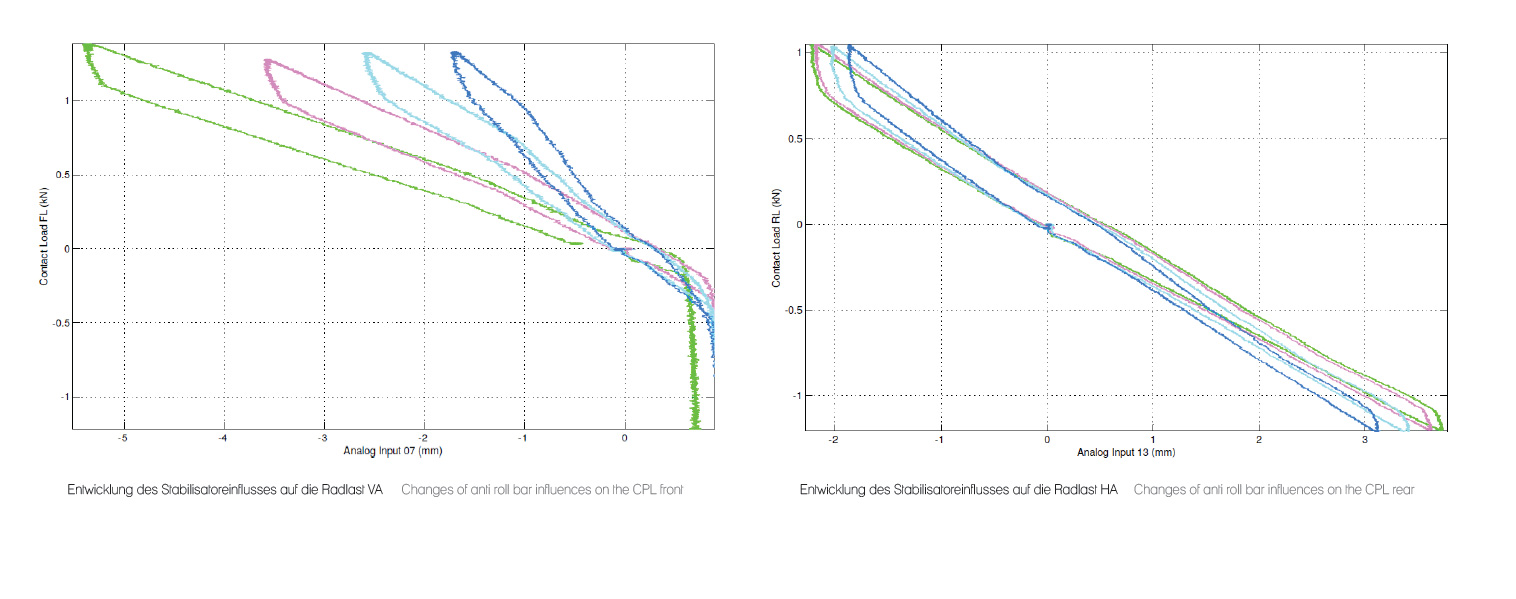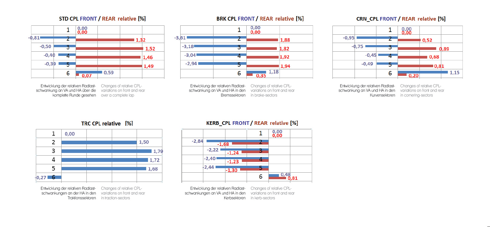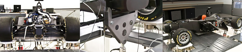In addition to operating the 4 wheel post, additional 3 actuators are used to simulate real driving forces. Excitation of the actuators via a drive file that was created with track iteration from real track data and an aeromap. The analysis is made track specific, global and sector-wise.