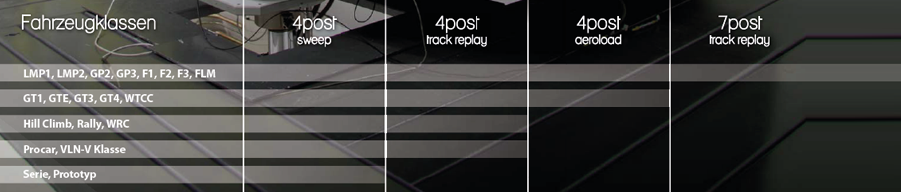 Servo test rig incl. engineer Preparation of data record, iteration of a track, sector classification 7 actuators 4 linear potentionmeter 4 sensors / hubs acceleration 2 sensors / body acceleration Workshop with 2 post lifts Packag for 1 day (8 hours) |