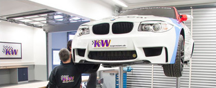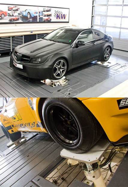 The KW test center in Fichtenberg provides motor sport teams and industry partners the ability to simulate suspension travel of the vehicle on actual race tracks. This is done KW's hydraulic 7-post Driving Dynamic Test Center.